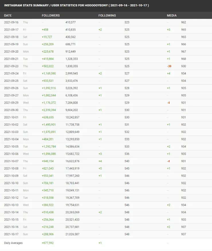 De acuerdo a los datos de SocialBlade, la actriz contaba con 410 mil seguidores hasta el 16 de septiembre, un día antes del lanzamiento del programa en el streaming. Al mismo tiempo que se generó la expansión de la ficción, ella acompañó comenzando a sumar apenas 19 mil followers hasta el día 18 de septiembre. Con el correr de la semana ese pequeño número se convirtió en hasta1 millón de seguidores diarios, dejando como resultado los 21 millones de la actualidad.