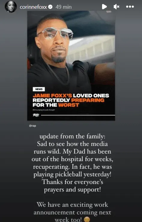 Corinne Foxx, quien también es actriz(Terror a 47 metros: el segundo ataque) acudió a sus historias de Instagram luego de que se informara que “los seres queridos de Jamie se preparan para lo peor“.
