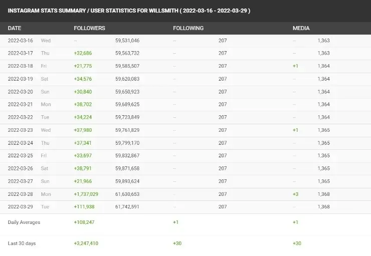 Con 61,7 millones de seguidores en total, su cuenta es actualmente la número 60º más popular de la red social de Mark Zuckerberg. Los datos explican que hasta la fecha sumaba entre 20 mil y 35 mil fanáticos diarios, pero todo cambió tras su inconveniente con el comediante. El gráfico también muestra que el día siguiente, el lunes, consiguió cerca de 112 mil seguidores, y se espera que continúe creciendo.