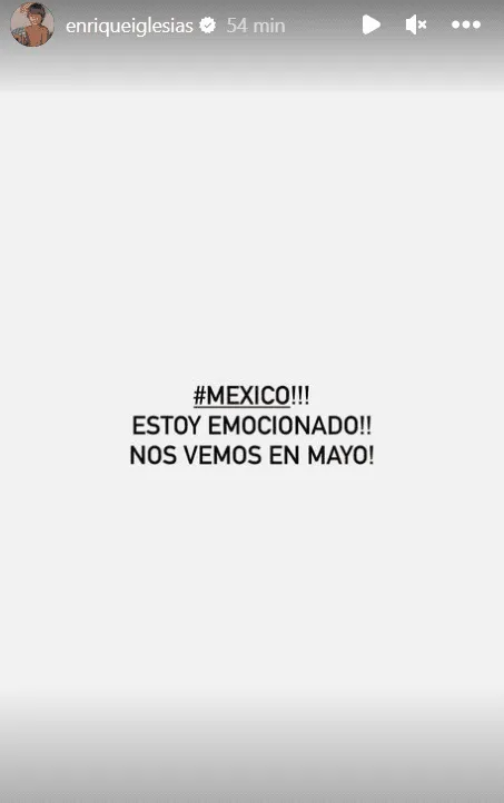 A través de una breve publicación en sus historias de Instagram, donde tiene casi 18 millones de seguidores, el intérprete de Bailando, Súbeme la radio y Nunca te olvidaré, entre otras, compartió su emoción de volver a tierras Aztecas y, según escribió, lo hará en mayo.