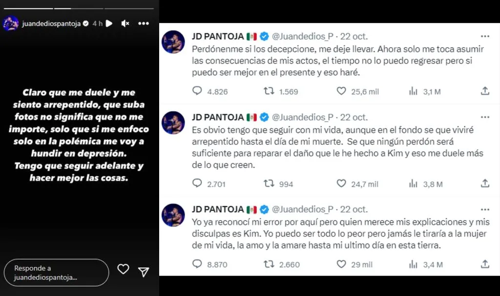 Juan de Dios Pantoja escribió unos tuits para responder a los ataques que ha recibido tras revelarse su infidelidad a Kimberly Loaiza con una modelo en Miami: “Yo ya reconocí mi error por aquí, pero quien merece mis explicaciones y mis disculpas es Kim. Yo puedo ser todo lo peor pero jamás le tiraría a la mujer de mi vida, la amo y la amare hasta mi último día en esta tierra”.