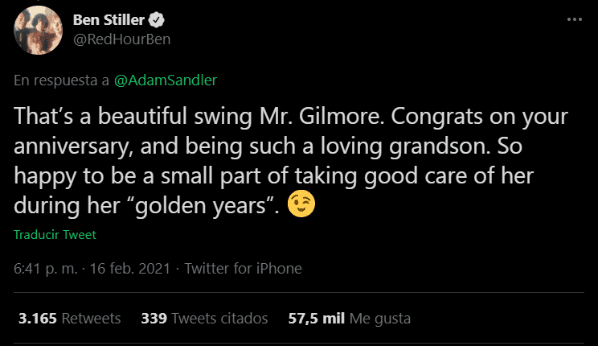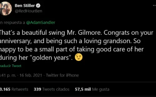 Quien también se hizo presente en los posteos fue Ben Stiller, intérprete delmalvado cuidador de la abuela de Gilmore: “Es un hermoso swing, Sr. Gilmore. Felicidades por tu aniversario y por ser un nieto tan cariñoso. Muy feliz de ser una pequeña parte de cuidarla bien en su “años dorados””.