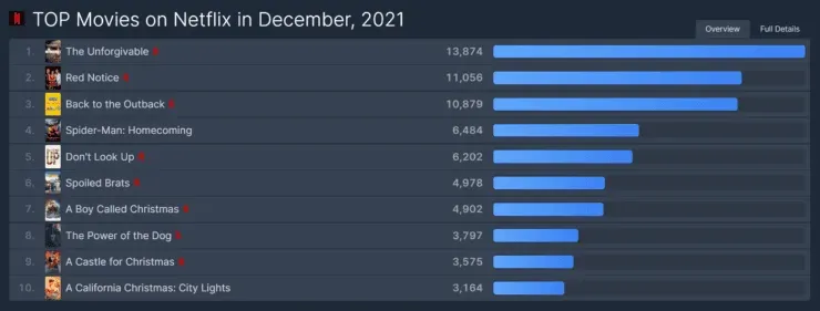 Alerta Roja comenzó con el fenómeno que se había convertido en noviembre, cuando alcanzaron la marca del mejor día de lanzamiento de la historia de la plataforma, pero con el tiempo fue perdiendo popularidad. El arribo más reciente y que generó imacto instantáneo fue Don’t Look Up, pero al haber tenido pocos días dentro del catálogo de contenidos no logró sumar una cantidad notable de espectadores como el siguiente largometraje.