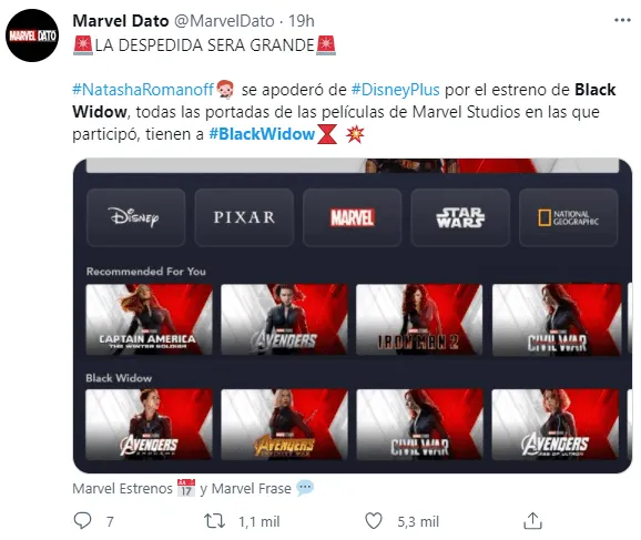 Otro aspecto destacado entre los fans fue que Disney+ homenajeó el lanzamiento con la imagen de Black Widow como portada de las películas donde participó el personaje. Los fieles de Marvel también expresaron su alegría por tener en la misma semana un nuevo estreno de Loki y el anuncio de What if…?