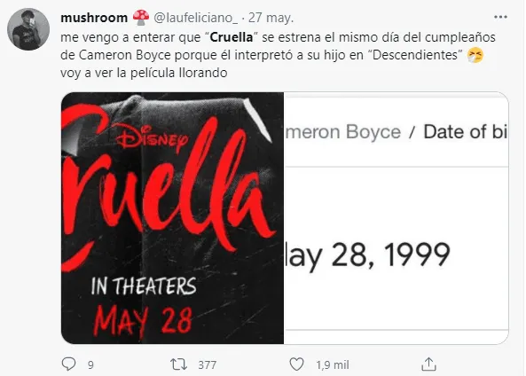 Otro de los puntos celebrados por lo fans fue la referencia a Cameron Boyce, actor de Disney fallecido en 2018 con apenas 20 años.En los últimos cuatro años de su vida, el joven interpretóaCarlos de Vil, hijo de la famosa villana de 101 Dalmatas, entres películaslive-actiony una serie animada. Como homenaje, Cruella se estrenó el día de su cumpleaños: el 28 de mayo.