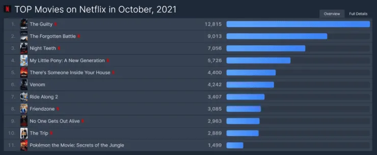 El servicio de streaming Netflix acaba de terminar octubre, donde se vio lacontinuación del éxito de El Juego del Calamar, aunque aquí nos centraremos en otro lado de su inmenso catálogo de contenidos. Aquí te traeremos el listado de las diez películas más vistas en la plataforma durante el último mes, el cual dejó en lo más alto a Culpable, protagonizada porJake Gyllenhaal. ¿Cuáles completan el ranking?