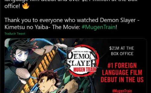 Con tres días en cartelera, este lunes las redes sociales de Demon Slayerconfirmaron que alcanzó los 21 millones de dólares en la taquilla, y de esta manera rompióel récord y se convirtió en la película extranjera con mejor estreno en un fin de semana de la historia deEstados Unidos.“Estamos realmente honrados y honrados por lo mucho que la película ha resonado entre la gente de todo el mundo”, dijo Atsuhiro Iwakami, presidente de Aniplex.