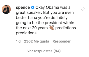 “Okay. Obama era un gran orador. Pero tu eres incluso mejor haha, definitivamente serás el presidente en los próximos 20 años. Predicciones, predicciones…”