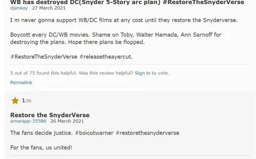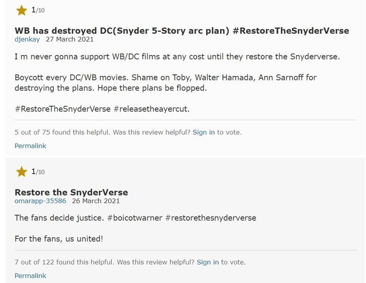 Los buenos números de taquilla contrastan fuertemente con algunas de las puntaciones que obtuvo la cinta en Internet. En IMDB la película tiene un promedio de 7,4 sobre 13,925 votantes, pero lo llamativo es que el 6,5% de los usuarios le puso un sólopunto de calificación. Muchos de ellos tuvieron algo en común: usaron el hashtag #RestoreTheSnyderVerse.