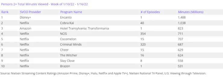 De acuerdo a Nielsen, lo más visto en Estados Unidos entre la semana del 10 y el 16 de enero de este año fue Encanto con 1,488 millones de minutos reproducidos. De esta manera, la película de animación que puedes ver en la plataforma Disney+ conquistó al público estadounidense con una historia que abarca la cultura colombiana como pocas veces se ha visto. El reconocimiento no culmina en este logro, ya que recientemente fue nominada a los Premios Oscar 2022 en dos categorías.