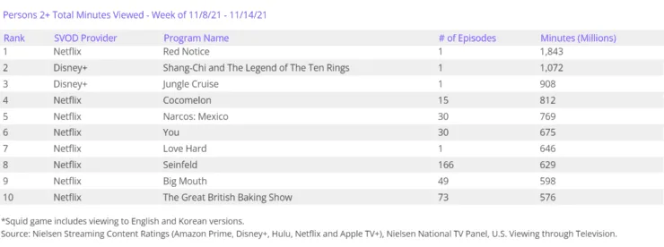 Fuera de Netflix, los siguientes puestos del ranking son para Disney+ con dos películas más: Shang-Chi y la Leyenda de los Diez Anillos, con 1,072 millones de minutos vistos,y Jungle Cruise, también protagonizada por The Rock, con 908 millones de minutos. El resto del Top de visualizaciones de Nielsen se completa con Cocomelon (812 M), Narcos: México (769 M), You (675 M), Love Hard (646 M), Seinfeld (629 M), Big Mouth (598 M) y The Great British Baking Show (576 M).
