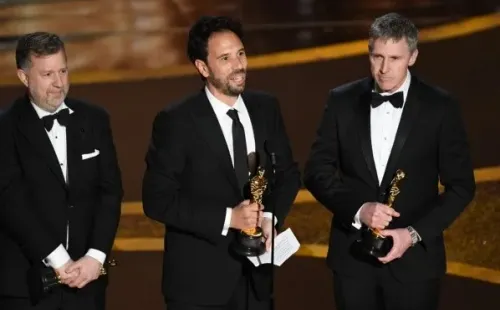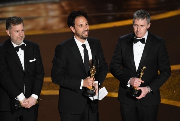 Greg Butler, Guillaume Roncheron y Dominic Tuohy con su premio a Mejor Efectos Especiales por 1917