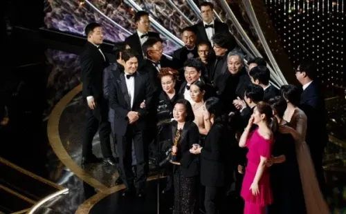El equipo completo de Parasite recibiendo el premio a Mejor Película