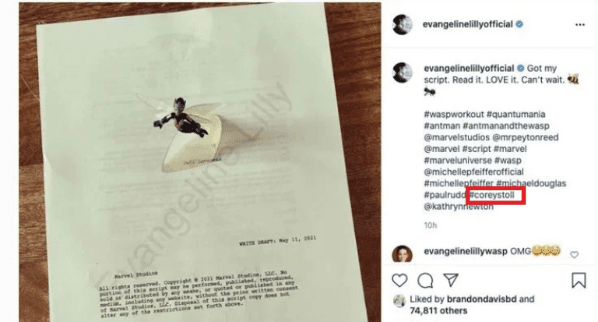 La actriz compartió en su cuenta oficial de Instagram: “Recibí mi guión. Lo leí. Lo amé. No puedo esperar”. El gran problema fue que el posteo estuvo acompañado de diversos hashtags nombrando a los actores que serán parte del film, y allí nombró a Corey Stoll, quien interpretó aYellowjacket, el primer villanode Ant-Man, y a quien teníamos algo olvidado, pero todo indica que dirá presente nuevamente en la saga.