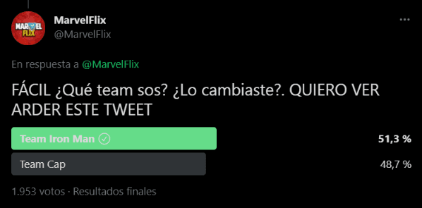 Por su parte, Iron Man apoyó firmar el documento, comentando que el acuerdo era necesario para demostrar que los Avengers eran una herramienta para luchar contra el mal y estar del lado de la ONU los separaría de todos los villanos. Cada uno tenía sus argumentos, al igual que los fans, quienes volvieron a votar en una nueva encuesta en la cuenta de Twitter @MarvelFlix, en la que participaron cerca de 2 mil votantes. ¡Estos son los resultados!
