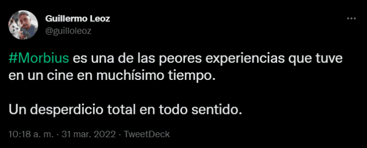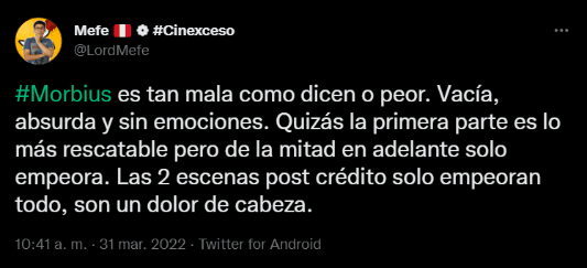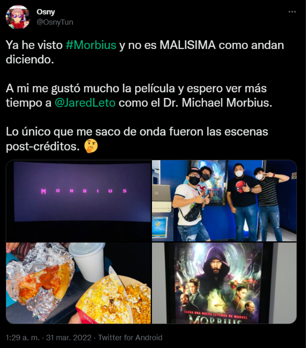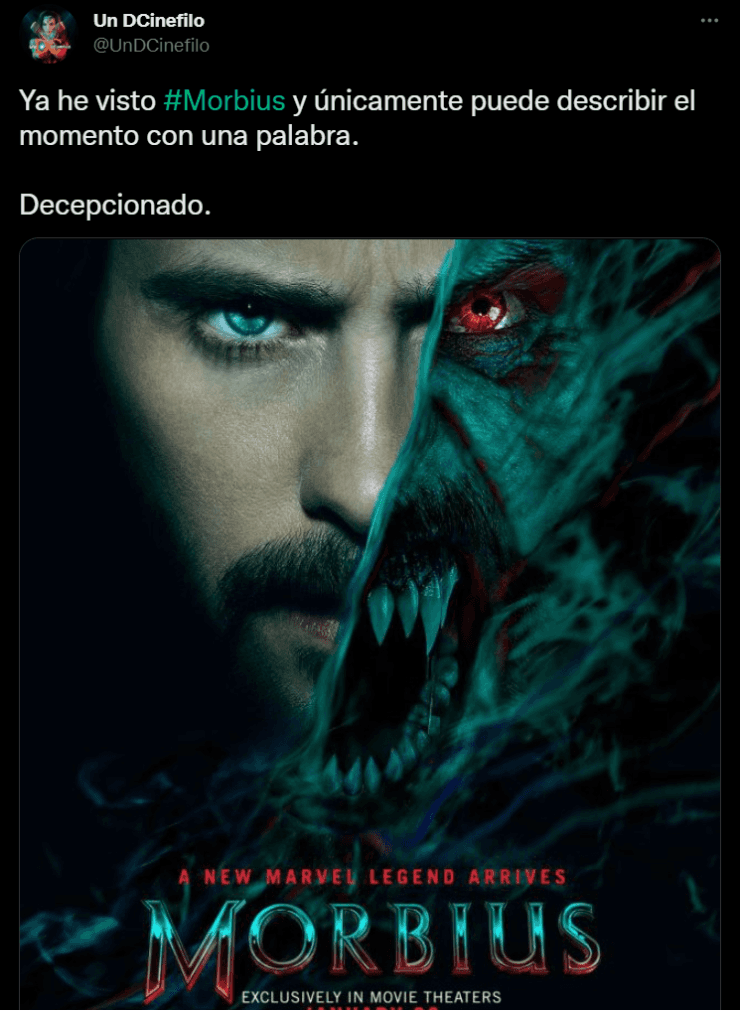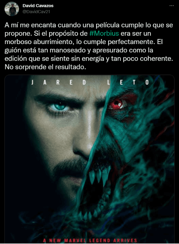 Marvel vuelve a celebrar un lanzamiento en el cine con Morbius, de la mano de Sony Pictures, una película muy esperada por los fanáticos que la esperan desde hace tiempo, ya que su estreno fue retrasado más de una vez a causa de la pandemia del Coronavirus. Finalmente, el público ya puede verla en la pantalla grande y algunos de ellos ya transmitieron sus sensaciones en las redes sociales. ¿Cuál es su opinión?
