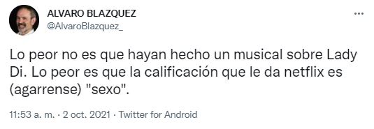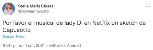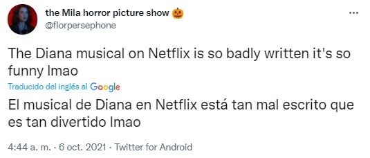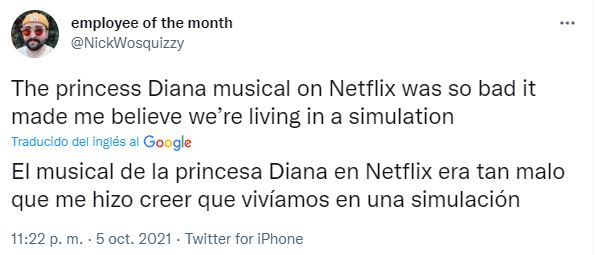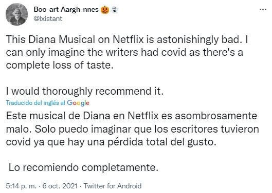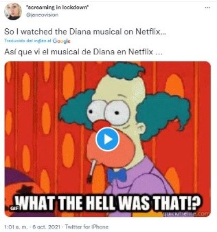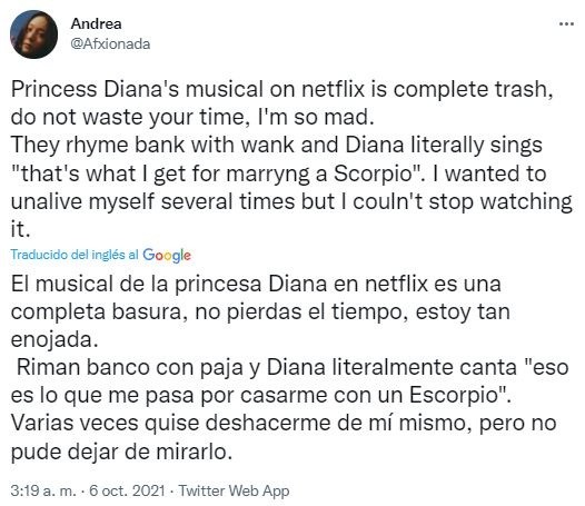 Desde la semana pasada, Diana ya está disponible en Netflix con un elenco que se completa con Judy Kaye como la Reina Isabel II, Ron Hartrampf como el Príncipe Carlos y Erin Davie como la Duquesa Camila. En noviembre de este año, tendrá su reestreno en Broadway y apunta a ser un éxito. Sin embargo, las primeras opiniones de quienes disfrutaron la producción son terribles. “El musical de la Princesa Diana en Netflix es una basura, no pierdan su tiempo”, escribió uno de los usuarios y generó una ola de críticas muy diferentes a lo que sucedió con The Crown. ¡Mira aquí algunas de las opiniones!