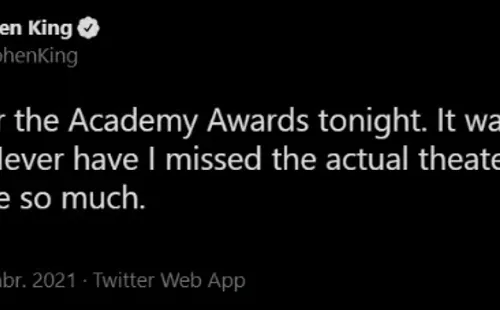 Es por esa razón que King sentenció la dificultad que le llevó votar en los Premios de la Academia este año. “Nunca me había perdido tanto la experiencia real del cine”, escribió en la red social, donde recibió comentarios de seguidores entendiendo su pensamiento, ya que para cualquier cinéfilo no fue fácil alejarse de las salas y las butacas, si bien la mayoría cuenta con la oportunidad de disfrutar contenidos en sus hogares.