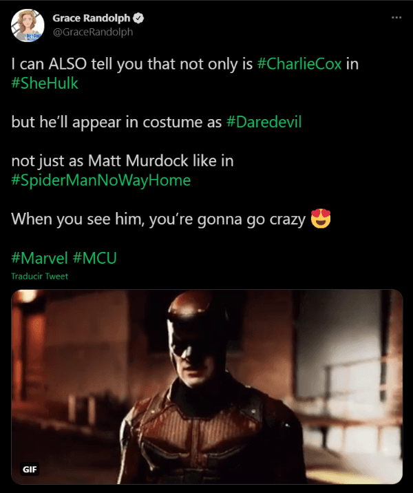 Desde principios de diciembre del año pasado se viene comentando acerca de la posibilidad de que Charlie Cox sea parte de la cinta del MCU, ya que desde la compañía confirmaron que el personaje iba a tener su lugar en la franquicia después de la cancelación de su serie en Netflix. Ahora, quien terminó de confirmar esto fue la presentadora Grace Randolph en sus redes sociales.