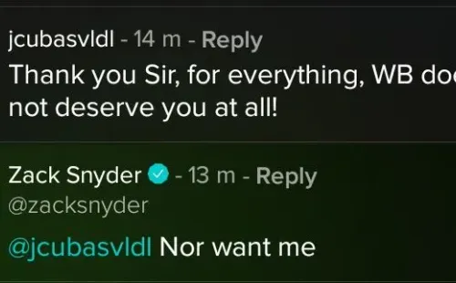 En las últimas horas se viralizó una respuesta de Zack en la que da por finalizado el proyecto del SnyderVerse. En la plataforma Vero, donde el director está activo desde hace un tiempo,un usuario le agradeció por lo hecho y le comentó que Warner no lo merece, a lo queel cineasta respondio: “(WB) no me quiere”. Rápidamente los comentarios en las redes sociales coincidieron en que se trata de algo personal contra él.