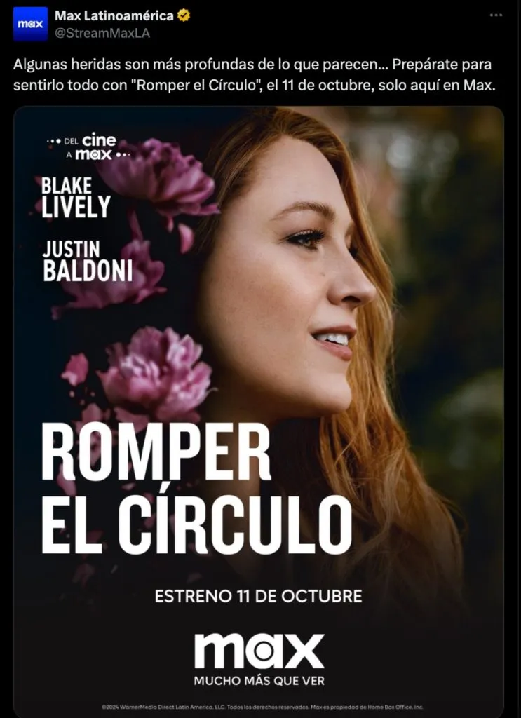 Después de ser furor en las salas de cine en el mes de agosto, la película ‘Romper el círculo’ (It Ends with Us) estará se estrena en Max (HBO) el próximo viernes 11 de octubre.