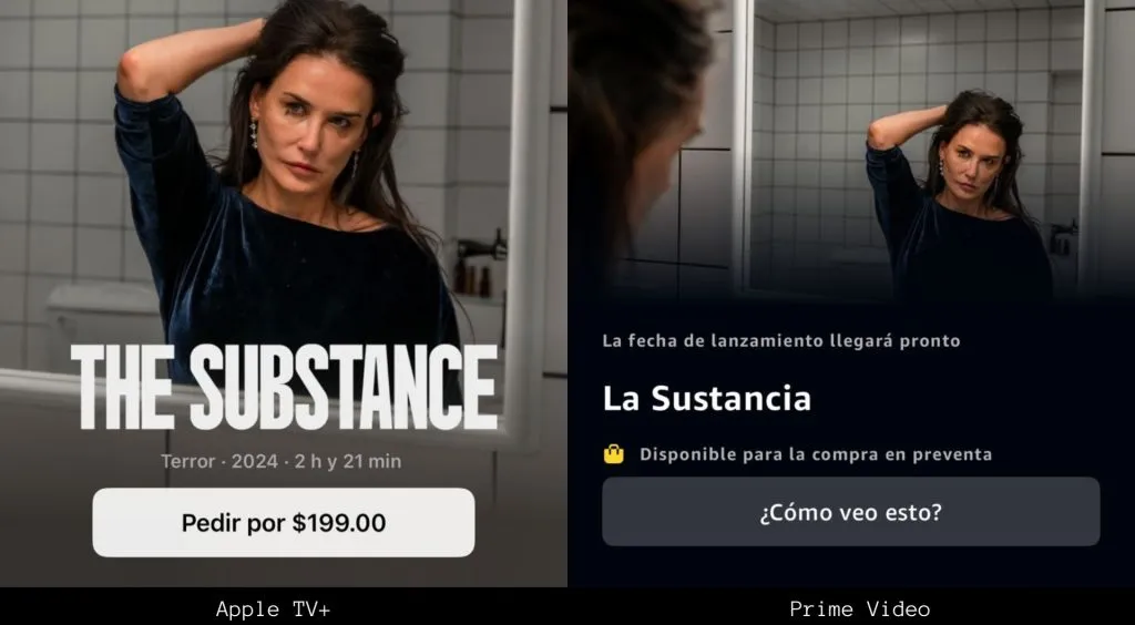 Si deseas ser de los primeros en ver ‘La Sustancia’ en formato de streaming, ya puedes comprar la película en preventa a través de Apple Tv y en Prime Video, por $199 pesos en cada una de las plataformas.