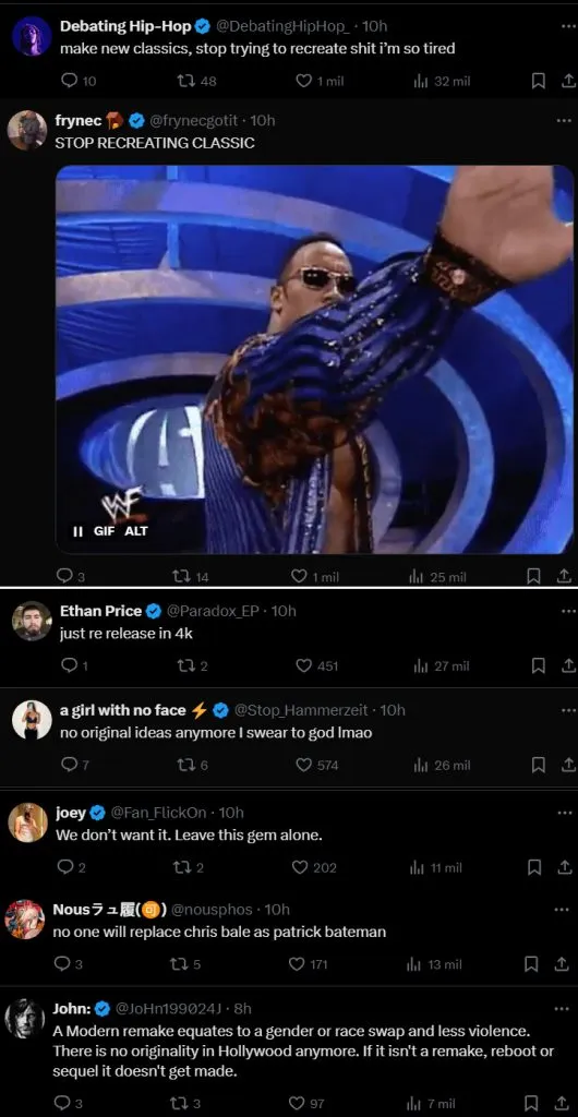 “No hay más ideas originales”, asegura un usuario mientras otro destaca que “nadie puede reemplazar a Christian Bale como Patrick Bateman”. Por otro lado, hay quienes exigen que “dejen esta gema en paz”, al tiempo que alguien destaca la crisis de Hollywood: “Si no es una remake, un reboot o una secuela, no se hace”.