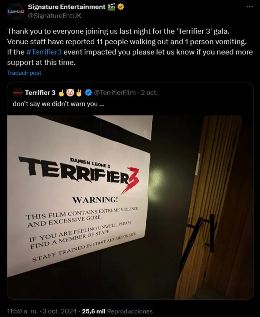 “Esta película contiene extrema violencia y gore extremo. Si te sientes mal, por favor busca a algún trabajador. Nuestros trabajadores están formados en primeros auxilios y se encuentran en el local”, se anunció en el cartel de la sala de cine donde se proyectó ‘Terrifier 3’.
