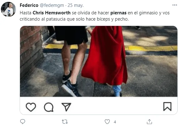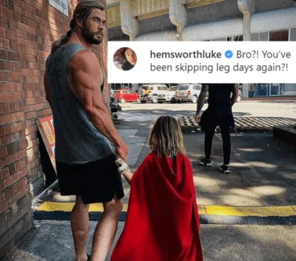 El retrato fue realmente contrastante: en el tren superior, Chris mostró sus impresionantes brazos entrenados, mientras que en el inferior dejó ver unas piernas mucho más flacas. Incluso su hermanoLuke Hemsworth respondió la publicación y fue directo en su pregunta: “¿Hermano?¿Has estado evitandoejercitar las piernas otra vez?”.