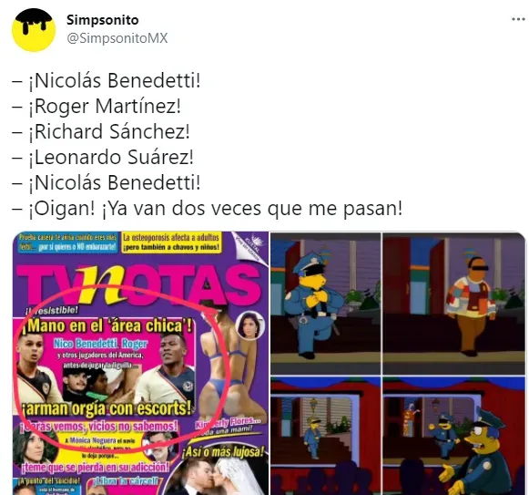 Los jugadores del AméricaRoger Martínez,Leonardo Suárez,Nicolás BenedettiyRichard Sánchez protagonizaron un escándalo nacional en las últimas horas porque fueron captados en una fiesta clandestina, sin respetar protocolos por el Covid-19 y con mujeres que no son sus parejas. La bomba explotó en el ambiente del futbol y generó todo tipo de reacciones. ¡Hasta lacomparan con un episodio de Los Simpson! Mira de qué se trata.