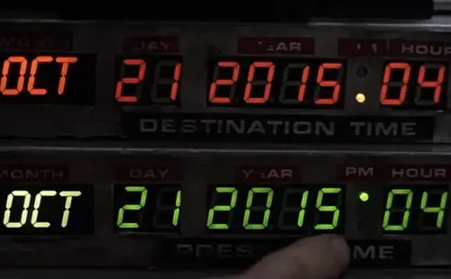 La segunda película comienza al momento que finaliza la primera, con ‘Marty McFly’ arreglando el pasado (1955), para regresar a 1985 en un futuro totalmente favorable para él, pero aparece el ‘Doc Brown’ y le dice que sus hijos adolescentes estarán en problemas, entonces deberá acompañarlo. Durante el viaje, Marty pregunta: “¿Dónde estamos?”, a lo que Emett contesta: “Nos dirigimos a Hill Valley, California, a las 04:29 PM del miércoles 21 de octubre de 2015”.