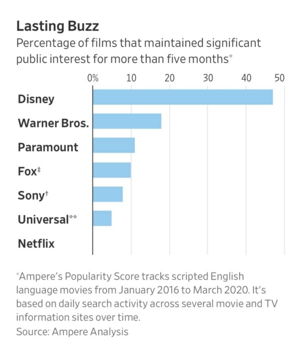 Quien se encuentra en unpolo completamente opuesto a Netflix es Disney, que obtuvo el promedio más alto tanto de público (70,3/100) como de la crítica (66/100) y cuenta con una popularidad más duradera de sus películas. En el ránking de Wall Street Journal observamos que en cuanto al interés siguen Warner Bros. Paramount, Fox y Sony.