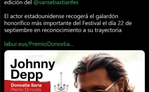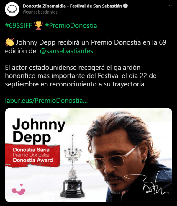 Pese a susituación personal, hay lugares en los que continúa siendo bienvenidos, como lo es en el Festival de San Sebastián, quienes le entregarán el Premio Donostia en la próxima edición de la ceremonia. Así lo reportaron en un comunicado: “Johnny Depp, uno de los actores más talentosos y versátiles de la cinematografía contemporánea, recibirá un Premio Donostia el día 22 de septiembre, miércoles, en el Auditorio Kursaal, dentro de la 69 edición del Festival de San Sebastián”.