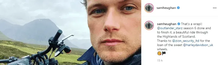 El protagonista del programa, Sam Heughan, fue uno de los primeros en expresarse ante la finalización de la actividad en Escocia. “Temporada 6 listay terminada, un hermoso paseo por las Tierras Altas de Escocia”, publicó el intérprete deJamie Fraser junto a una imagen con una motocileta en los increíbles paisajes británicos.