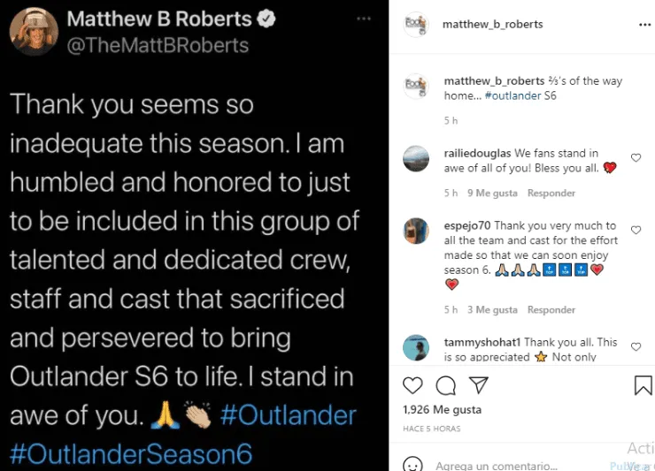 El productor y escritor, Matthew B Roberts, también destacó el esfuerzo que hizo todo el staff para llevar adelante las grabaciones: “Me siento honrado de ser parteen este grupo de equipo, personal y elenco talentosos y dedicados que se sacrificaron y perseveraron para dar vida a Outlander S6”.