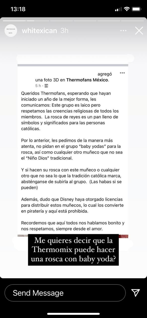 “La rosca de reyes es un pan lleno de símbolos y significados para las personas católicas. Por eso, les pedimos de la manera más atenta, no pidan en el grupo “baby yodas” para la rosca, así como cualquier otro muñeco que no sea el “Niño Dios” tradicional”, relataba parte del pedido.