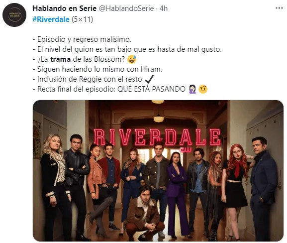 El regreso de Riverdale también cosechó algunas críticas que se suman a las realizadas sobre tras los primeros 10 capítulos. La trama de lasBlossom estuvo entre los puntos más criticados por los aficionados. “No entiendo en absoluto la historia de Blossom. Seriamente. ¿Qué diablos fue eso?”, fue el tono de los comentarios.