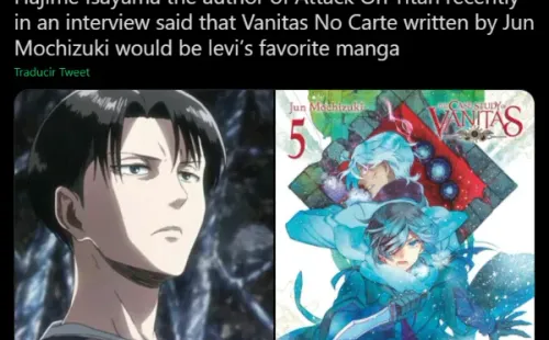 Para conocer esta parte de la historia debemos esperar hasta el invierno japonés, que va desde diciembre de 2021 hasta marzo de 2022. Mientras tanto, Isayama no puede despegarse de su obra maestra y se sigue refiriendo a su gran figura. En una entrevista reciente fue consultado por una insólita cuestión: ¿Cuál sería el manga favorito de Levi Ackerman? La respuesta:Vanitas no Carte.