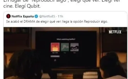 De hecho, hace tan solo unas horas, mediante el twitter oficial de Netflix España, presentaron la nueva función con un vídeo que explica lo necesario para entender de qué se trata. “Se acabó el drama de elegir qué ver: llega la opción reproducir algo”, escribió la página oficial para acompañar este audiovisual que muestra a una pareja tratando de escoger algo para entretenerse, pero el control remoto los frena y les explica una forma más fácil y ahorrativa.