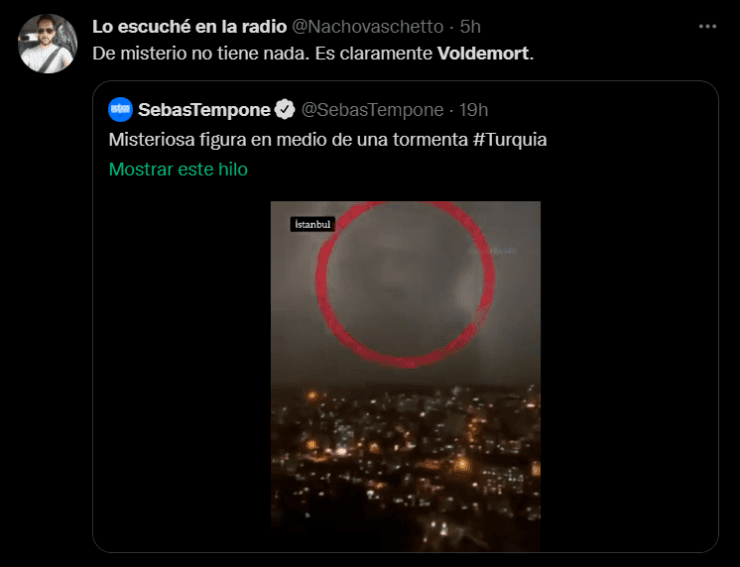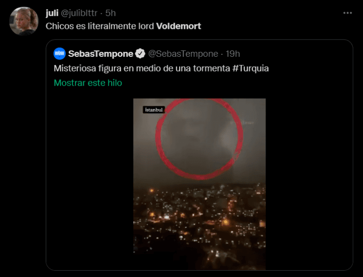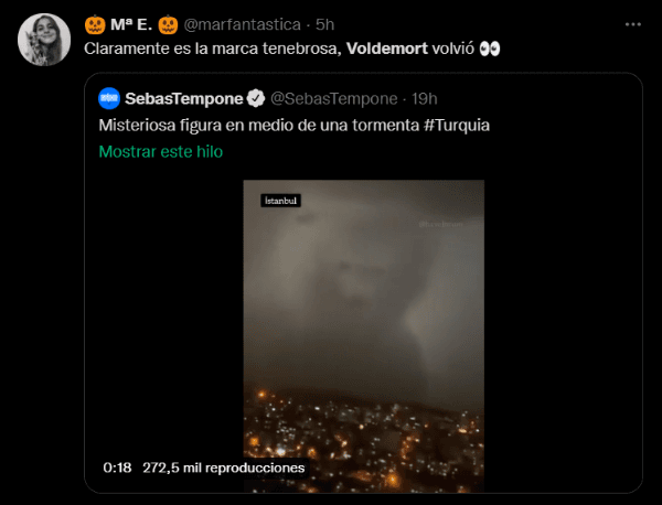 Estambul, Turquía. Una tormenta azotó la ciudad el último sábado por la noche y los habitantes captaron imágenes aterradoras, según algunos de ellos, ya que aseguran ver un rostro humano en el cielo formado por una nube. Las redes sociales se hicieron eco de esta novedad y algunos bromearon con que se trataba de nada más y nada menos que Lord Voldemort, el villano de Harry Potter, saga que puedes encontrar en HBO Max.