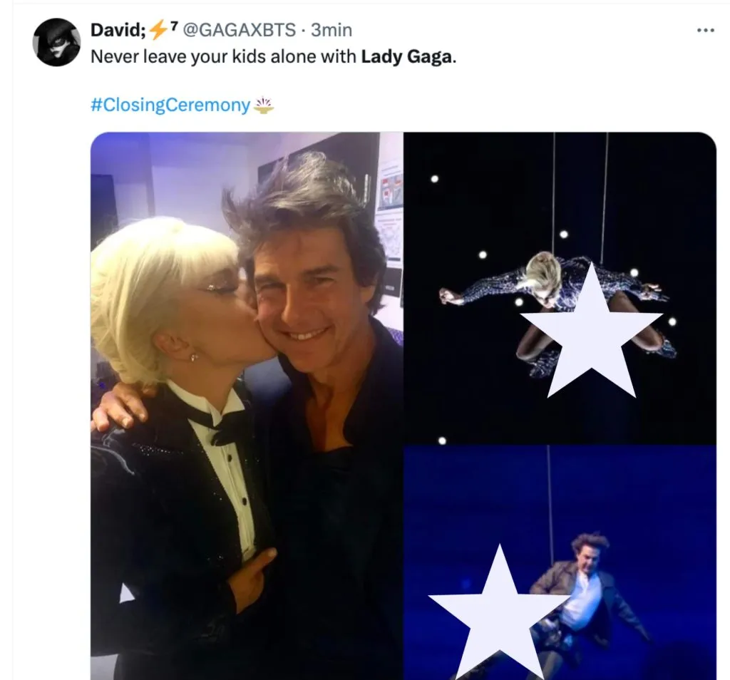 Tom Cruise descendió en rapel al estadio, al mismo tiempo que H.E.R tocaba la guitarra, saludó a los atletas y aceptó la bandera olímpica, saltó a una motocicleta y salió del estadio, mientras la imágenes pregrabadas su camino rumbo a Estados Unidos.