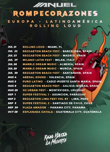 La gira de Anuel se llama “Rompecorazones” y en cada uno de sus conciertos estará repasando todos sus éxitos. Es por ese motivo que no faltarán hits como “Más rica que ayer”, “Hasta que dios diga”, “Amanece”, “La llevo al cielo”, “Mejor que yo” y “Ella quiere beber”.