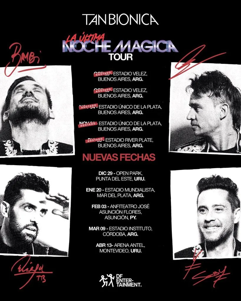 Tan Biónica, una de las bandas pop/rock más reconocidas y convocantes de Argentina, anunció una gira internacional titulada “La Última Noche Mágica”. Luego de haber agotado las entradas para tres noches en el Estadio José Amalfitani de Vélez Sarsfield, dos en el Estadio Único de La Plata y dos en el Estadio Monumental de River Plate, confirmaron que se presentarán en Uruguay y Paraguay durante el 2023 y 2024.