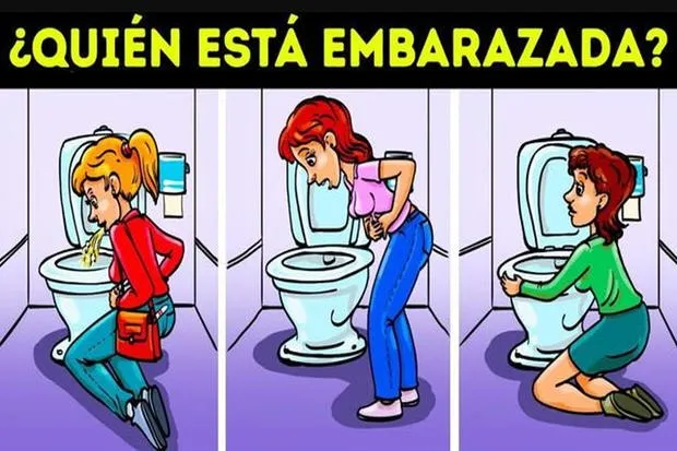 Para ello, observa la imagen que acompaña al test. En ella se pueden ver a 3 mujeres en la misma situación: frente a un inodoro. Una de ellas está vomitando y las otras dos están a punto de hacerlo. Tu tarea es agudizar tu sentido visual y determinar cuál de ellas está embarazada.