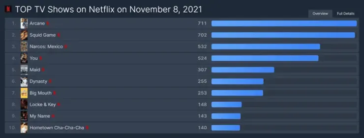 El estreno reciente que se posiciona en lo más alto del Top 10 a nivel mundial según FlixPatrol es Arcane, la serie basada en el universo del mítico videojuego League of Legends y desarrollada por Riot Games. El sábado llegó a la biblioteca con sus primeros tres episodios, los cuales fueron elogiados y celebrados por los fanáticos que la llevaron a ser lo más visto en 38 países, incluidos Argentina, Chile y Brasil.