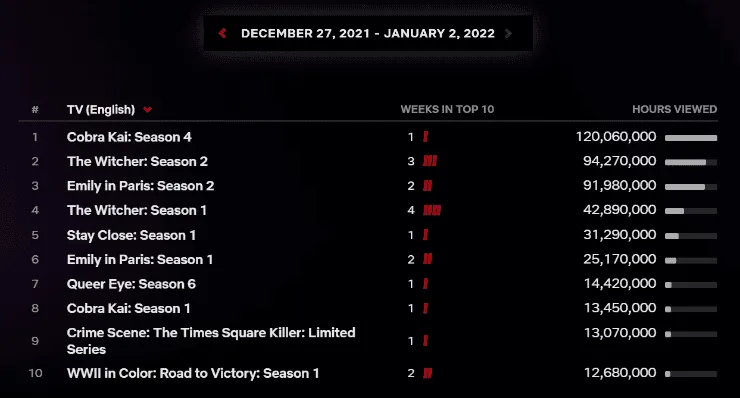 Posteriormente llegó la segunda entrega de The Witcher, protagonizada por Henry Cavill, que tardó más de dos años para regresar a la plataforma por diversos problemas generados por la pandemia del Coronavirus. A los pocos días arribaron los nuevos capítulos de Emily in Paris, que se mantuvo como el programa más elegido por los usuarios hasta algunas horas, ya que se confirmó oficialmente que fue superada por Cobra Kai.