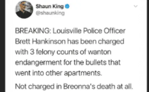 “Lo que dice esta decisión de hoy es que los fiscales valoraban MÁS un maldito muro al que le dispararon de lo que valoraban la vida de una mujer negra inocente. Ese muro fue tratado con más dignidad hoy que Breonna. Es asqueroso. Estaba desarmada. No violó lasleyes”, fue el tweet del activista Shaun King queAmybeth compartió y al que agregó que ella “no podría haberlo dicho mejor”.