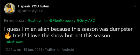 No hay dudas de que fue una temporada movilizante por momentos como el contagio de COVID-19 deMeredith Grey y la separación de Link y Amelia. En las redes, muchos aficionados le enviaron mensajes a la protagonista de la ficción, y entre ellos apareció el siguiente: “¡Creo que soy un extraterrestre porque esta temporada fue una basura! Me encanta el programa, pero no esta temporada”.