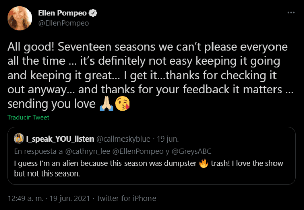 Lo que nunca imaginó este fan es que Ellen Pompeo le iba a responder y la cruzó: “¡Todo está bien! Diecisiete temporadas no podemos complacer a todo el mundo todo el tiempo… Definitivamente no es fácil mantenerlo en marcha y mantenerlo genial… Lo entiendo. Gracias por verlo de todos modos y gracias por tus comentarios, es importante. Te envío amor”.