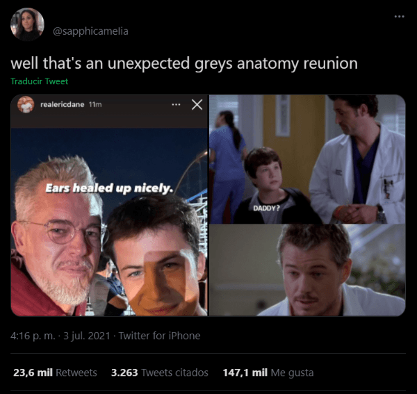 Recientemente se hizo viral en las redes sociales una foto entre dos actores que comparten la siguiente particularidad: ambos compartieron pantalla en Grey’s Anatomy hace mucho tiempo. Se trata de Eric Dane, quien encarnó a Mark Sloan, y Dylan Minnette, a quien vimos en la cuarta temporada del show y en 13 Reasons Why. ¡Mira la imagen que generó más de 140 mil likes y más de 25 mil retweets!